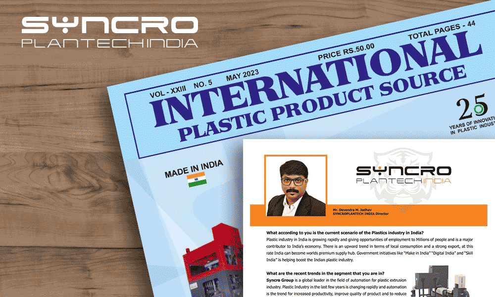 We’re on INTERNATIONAL PLASTIC PRODUCT SOURCE, PLASTVISION INDIA’s magazine Below is an interview with Devendra M. Jadhav, our director of SYNCROPLANTECH INDIA!  What according to you is the current scenario of the Plastics industry in India? Plastic industry in India is growing rapidly and giving opportunities of employment to Millions of people and is a […]