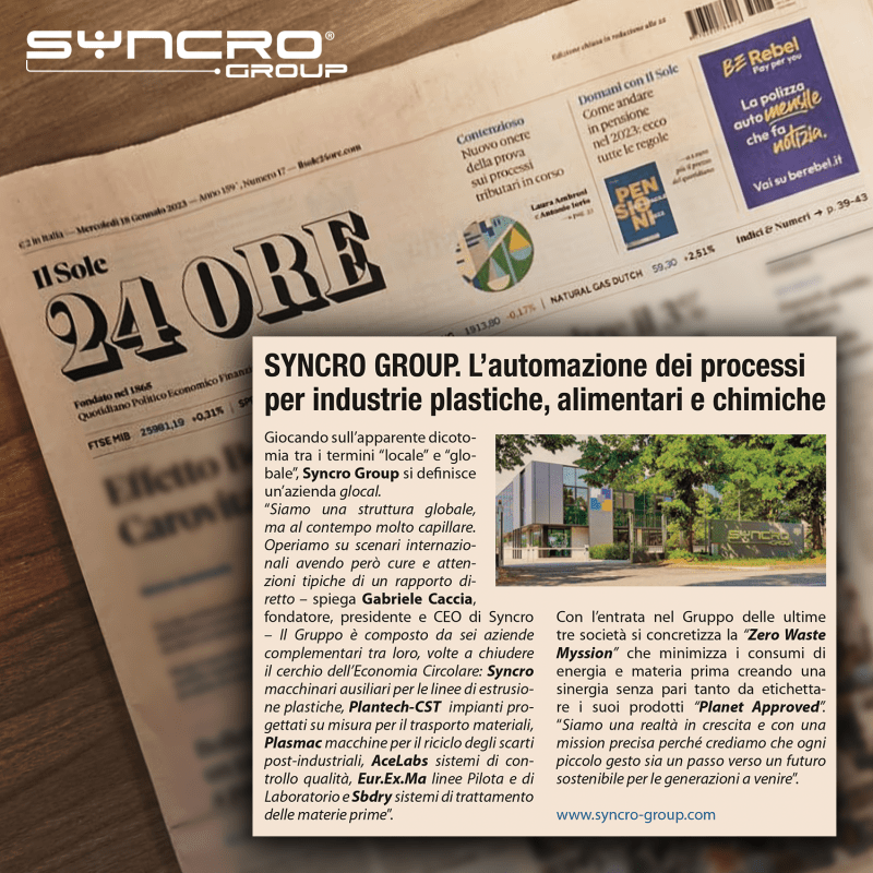 “We are a global structure, but at the same time capillary. We act on international scenarios but having the care and attention typical of a close relationship – explains Gabriele Caccia, founder, president and CEO of Syncro – The Group is composed of six complementary companies, closing the circle of the Circular Economy: Syncro auxiliary devices for plastic extrusion lines, Plantech-CST custom designed systems for material transport, Plasmac machines for recycling post-industrial waste, AceLabs quality control systems, Eur.Ex.Ma Laboratory& Pilot lines e Sbdry systems for the treatment of raw materials”.