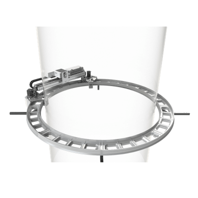 SKYMEX Il misuratore di spessore oscillante o rotante attorno alla bolla estrusa può essere capacitivo a contatto, capacitivo no contact o a raggi X backscatter. Il sensore installato sull’elemento centrale di una trave telescopica a tre stadi (brevettato da SYNCRO) è sempre allineato all’asse della bolla in posizione mediana tra i due carrelli motorizzati sui quali è imperniata ai suoi estremi. Principali pregi della macchina sono: i ridotti ingombri in rotazione fondamentali per l’installazione su esigui spazi delle incastellature del cliente, la rigidezza della trave telescopica, l’assenza di vibrazioni e il range di lavoro esteso fino a un rapporto 4:1 tra diametri della bolla massima e della bolla minima.