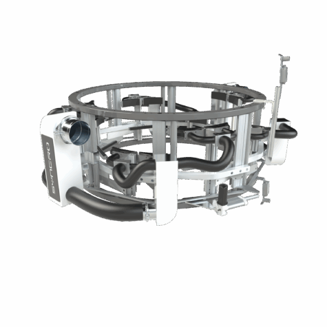 Una serie di bocche posizionate tra la testa di estrusione e la base inferiore dell’anello di raffreddamento è collegata ad un ventilatore di aspirazione. Il flusso aspirato attraversa i filtri presenti nelle bocche e viene depurato dai monomeri.